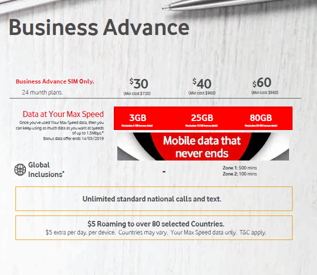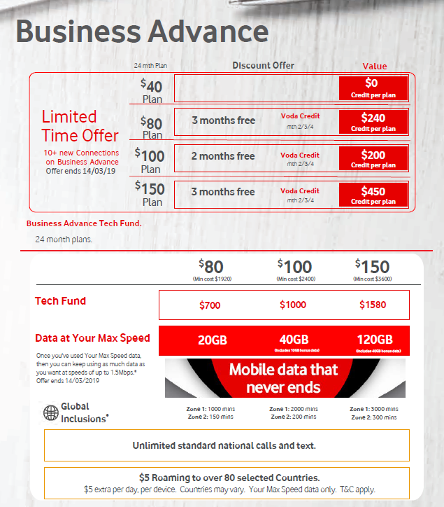 We understand that businesses require predictability and appreciate flexibility – that’s why we’ve introduced Business Advance. If you want 10 or more connections, our Business Advance plans give you exceptional choice and value. Choose either a plan that includes a Tech Fund or sign up to a BYO plan if you have your own devices. All our Business Advance plans come with Your Max Speed data, and then you can use as much data as you want at speeds of up to 1.5Mbps. You can’t share the inclusions on Business Advance. Our $40 and above Business Advance plans also come with loads of standard international minutes to Zone 1 and Zone 2 countries. And with ReadySupport, you’ll get a Personal Account Manager who’ll give you one-on-one attention.